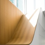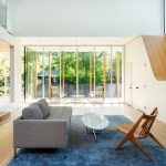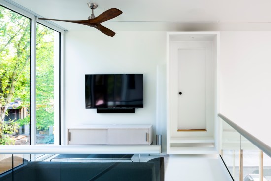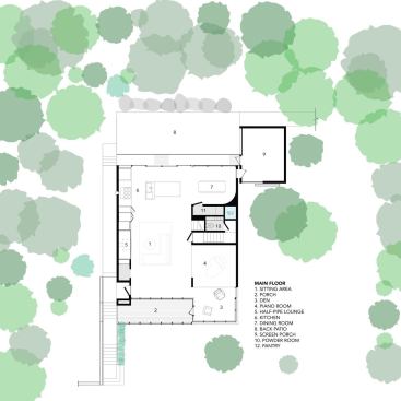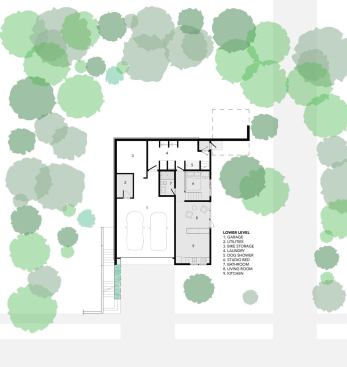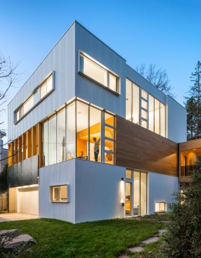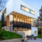 From the architects. The Stack House is like a child’s stack of blocks. Solid blocks of private spaces, are stacked in an open, laced pattern to form voids for shared living space. The long and short sides of the blocks are positioned in response to the urban and natural setting of the Stack House. On the mid level, the blocks run perpendicular to the street to open parts of the main living space to the street below and garden behind. On the lower and upper levels, the blocks run parallel to the street to shape privacy for bedrooms, baths and utility spaces. The result of this laced stacking is an open, two-story void of shared space that is simultaneously protected for privacy and immersed in its natural surroundings. To open a view to the lake, visible off the corner of the stack, the mid level block is pushed back from the street, like a move in a Jenga game, thereby making the corner a micro void for solitary contemplation of the water beyond. Contrasting materials of corrugated metal, wood, and glass—express this stacking and shifting on the exterior. Inside, the blocks are carefully carved with curves and surfaced in white oak to shape more intimate spaces to join a family together to share a meal, to recline, read and take in the majestic oak outside, or to play the piano to fill the void with music.