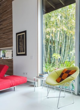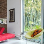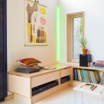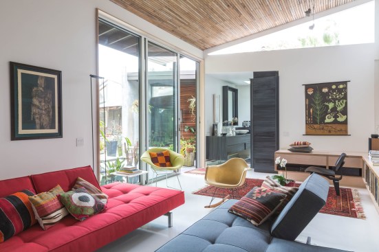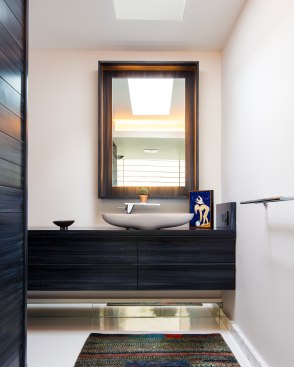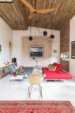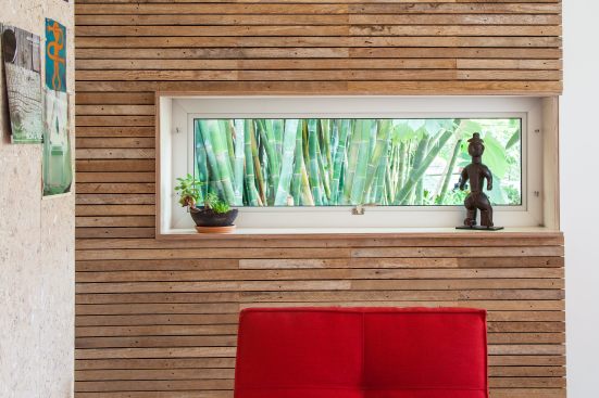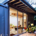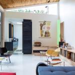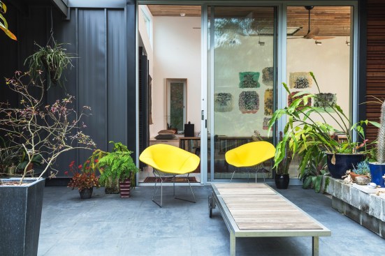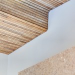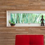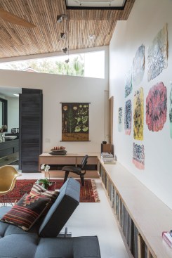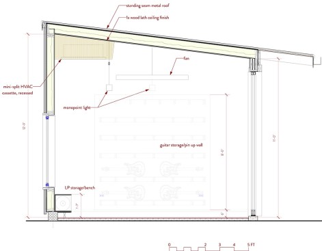 At the rear of an existing mid-century ranch-style residence in the Lower Garden District, a studio and guest pavilion is designed to provide temporary quarters for visitors and permanent space for the owners’ creative endeavors, including fine art and music, while focusing on blurring the line between interior and exterior space as an environmental experience. The existing yard is a lush garden–lovingly cultivated year-round by the owners–who spend a significant amount of time out-of-doors. The program includes an expansive studio with concealed storage for guitars–which doubles as pin-up space–and built-in display storage for LPs, which also performs as a bench with cabinets for a turntable, receiver and flat files. A serene bathroom is adjacent, with custom cypress vanity, mirror and wardrobe, and a marble-clad shower and bench with infinity-edge window to further dissolve indoor/outdoor separation. The soaring studio space is proportioned for maximum filtered light and acoustic performance for playing of live guitar and recorded music. Oversized sliding glass doors and smaller operable windows encourage cross-ventilation, and a bathroom skylight allows venting from that area. A dual-height, low-sloped standing seam metal roof responds to programmatic needs and existing building conditions. The interior includes seamless, epoxy-coated floors, and wood lath as a wall finish to bring visual warmth and acoustic absorption to the space. Exterior Ipe wood siding in a rain-screen assembly and blown-in insulation improve the building’s thermal envelope. Custom metal window and door frames add to the bespoke quality of the space.
