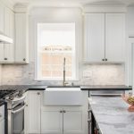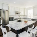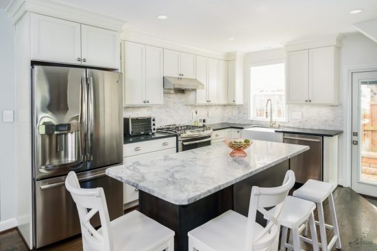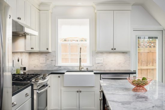 The kitchen features painted white Schrock Denton Maple custom cabinets and dark soapstone countertops on the perimeter. The island was basically the reverse with a dark finish on the cabinetry and a light marble top. A marble octagon tile backsplash, stainless steel appliances, fireclay farmhouse sink and commercial retractable faucet provided the finishing touches.