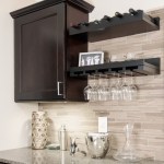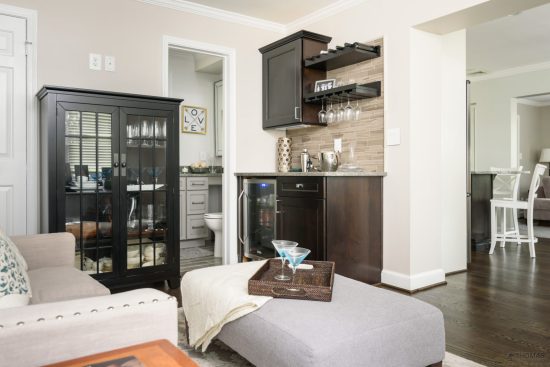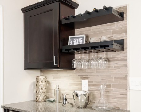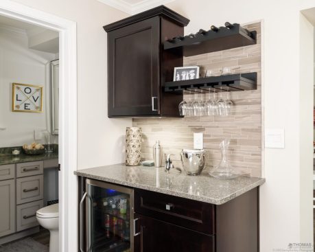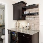 For the buffet area in the study we used dark mitered custom cabinetry with floating wine shelves and built-in wine fridge In the powder room we installed an antique white mitered custom vanity, granite countertop and coordinating tile flooring.