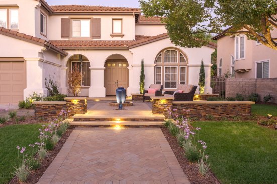 This project consists of a front yard and backyard outdoor living remodel. The homeowners of this project were looking for a tranquil outdoor space that they could escape in after working a long work week. The emphasis on creating 'tranquility' was crucial for both homeowners. They love the soothing sounds of water and wanted this to be the main focus for both the front yard and backyard. They were also interested in reclaiming some of the space in their front yard. The front of their home had plenty of square footage to utilize, the homeowners just weren't sure how to do it. Our team came in and designed a complete overhaul for both the front and backyard. The front yard redesign included an oversized paver patio, a new walkway and entryway complete with accent wall and pillars, plus a water feature. One challenge we encountered with the front yard walkway was with the slope in the grass. Originally, the design didn't call for steps, but after evauluating the grading and long-term goals for the homeowners, it was decided to add in steps to the new walkway design. The backyard also needed to focus on bringing out tranquility through use of water features. The homeowners really wanted a focal point out back, so the design we created included a custom, oversized natural stone veneer water feature placed at the end of their yard but in direct view from their sliding glass door. This way every time the homeowner or their guests look out back or step outside, the water feature is the first thing they will see.