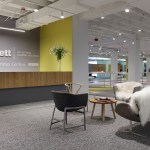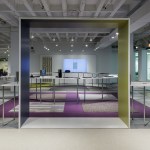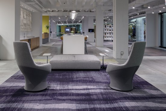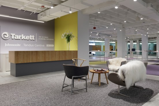 Showcasing Tarkett’s flooring products in an optimal fashion required careful preparation of existing surfaces and a flexible and subtle lighting solution. Existing exposed utility piping and new mechanical systems were carefully painted. Restraining the palette to glass, muted colors and furniture made of natural materials complements the historic character of the Merchandise Mart and allows the product to be the focal point.