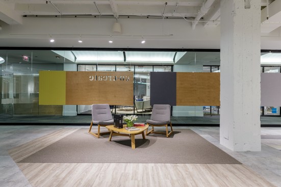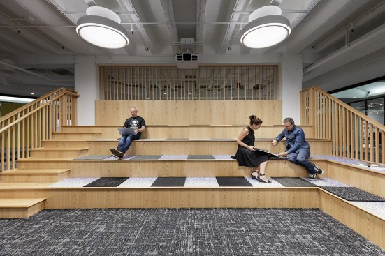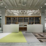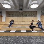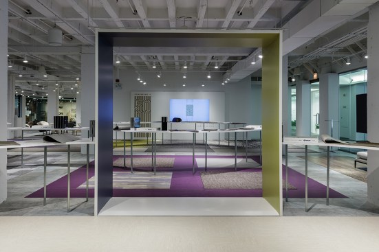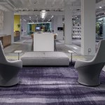 A key goal of the project was to highlight solutions for Tarkett’s four main industry sectors: Healthcare, Workplace, Retail, and Education. A custom collage made of white pieces of wall base is artfully framed to welcome visitors. To keep the experience focused on the flooring itself, the showroom is largely comprised of transparent glass panels, with open views to the reception area, large flooring lab, materials library, café, and theater. Large, rectangular portals lead visitors to key product areas. Social lounge spaces with casual and collaborative seating arrangements are interspersed throughout the showroom. A dynamic place for the design community to gather, the showroom can host a wide variety of events and meetings. A flexible presentation space features stadium seating with seating surfaces perfectly sized to accommodate loose carpet tiles as cushions, a clever way to display yet more product.