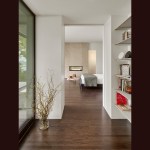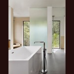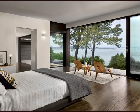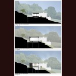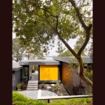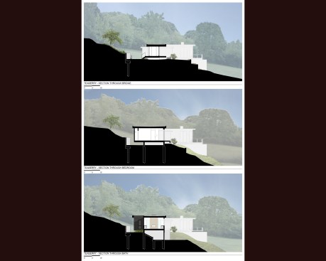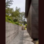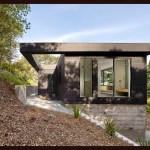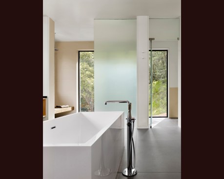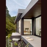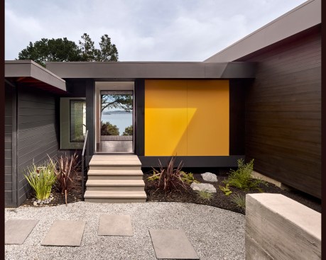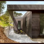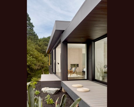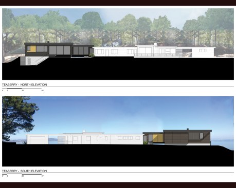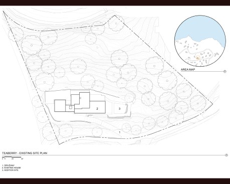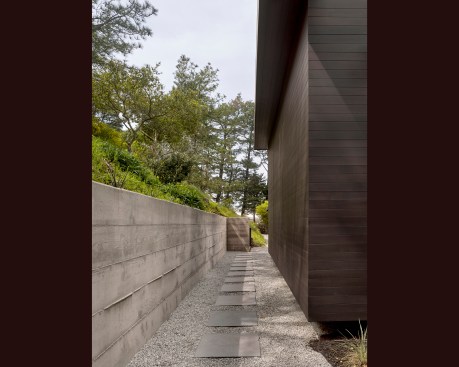 PROJECT DESCRIPTION Teaberry is a master suite addition to a simple, single-story mid-century house on a wooded lot overlooking the northern San Francisco Bay. The owners dreamed of a serene, modern retreat immersed in the nature. Architecture, landscape and interior design form a unified narrative about dwelling on this spectacular hillside site. The addition telescopes eastward from the existing house, navigating changes in topography as the land slopes away. Teaberry’s functional program includes a bridge, a porch, a bedroom and bath. Teaberry’s metaphorical program is nature present in five classical elements: earth, fire, water, air and aether. As the addition extends across the site, the form modulates to resist and yield to the earth's force. The fossilized-limestone fireplace connotes primal simplicity. Water’s salutary effects extend from the Bay to the bath’s restorative tub and porch-like shower. Large openings admit the sky, daylight and wind. The fifth element, similar to the Japanese concept of "ku", is "the void" found in the double-cantilevered roof and porch, which creates dualities such as "above and below" and "inside and out" for spiritual contemplation. SITE CONDITIONS AND STRATEGY Since there was level ground adjacent to the existing house construction appeared easy. The geotechnical report, however, proved otherwise as a history of slides and varying depths to bedrock were revealed. Hillside retention, water management, installation of a light-commercial grade sprinkler system throughout the whole house and wildfire resistance required substantial resources. More than 30 piers and a 50ft long retaining wall help mitigate hillside movement. Bioretention planters, swales and extensive site drainage help deter erosion. Exterior materials and landscape management address California’s strict Wildland Urban Interface environmental code. Despite the building’s horizontality, the addition is a study in section. The floor of the existing house is at grade but the addition is raised up two feet, establishing its own datum. At the house, the hill flows under the bridge and out to the bay side. In the middle, the bedroom cantilevers over the foundation, creating a shadowed separation between wall and ground. At the end, under the bath, a concrete mechanical room anchors the building to the slope. Minimizing excavation and foundation area provided both cost-savings benefits as well as expressive opportunities. ADDITION DESIGN The expanded building is read as a “modulated bar.” The new exterior has its own material language but is compatible with the original construction. Orange MDO panels announce the joint between old and new while unified overhangs and a dark palette maintain massing continuity. Small-scale, cedar siding is a quiet departure from the original wide planks which are aggressively differentiated. Warm-black stain adds depth and dimension to the cedar surface in contrast with the flat black paint on the older siding. Board-formed concrete used in the retaining wall and foundation visually connects landscape and building forms as one concept. The voluminous interior breaks with the older building’s small rooms and openings. Multi-slide doors and 16ft vanities emphasize the horizon while the limestone-clad fireplace adds an elemental vertical counterpoint. Coffee-stained wood floors and warm gray tile temper the sun. Light is transmitted through clear, translucent and mirrored glass. Porcelain wall tile impressed with linen from tofu production; hand-set ceramic tile with a mottled, reflective glaze; and the grain of book-matched maple add intimate, tactile textures within the minimalist language.