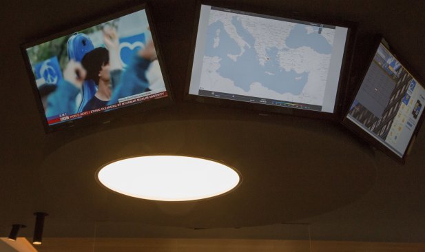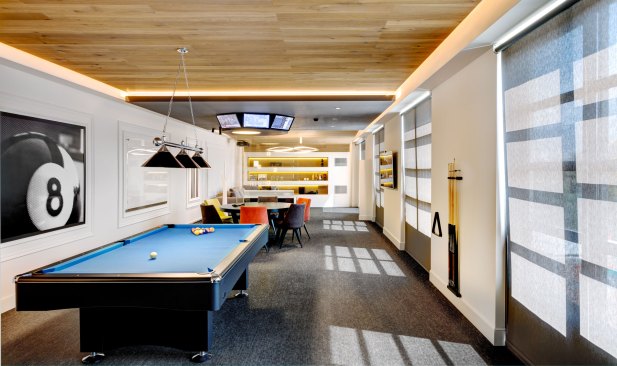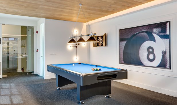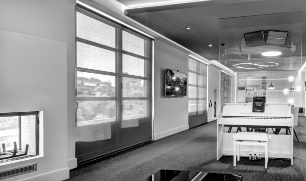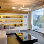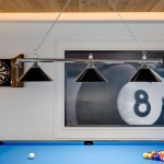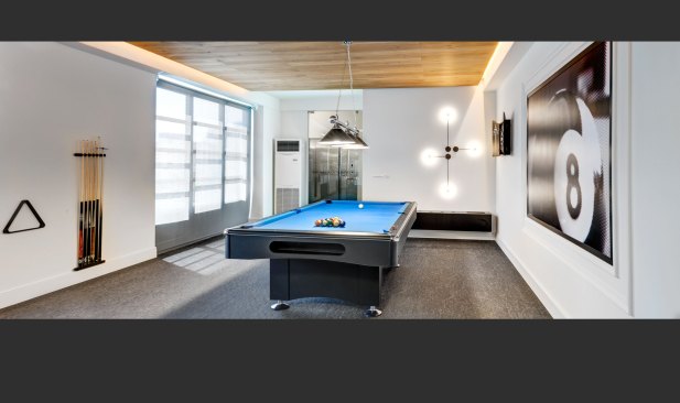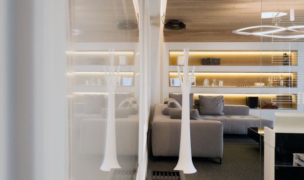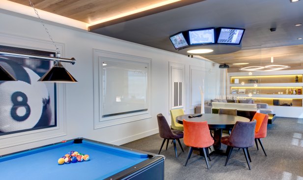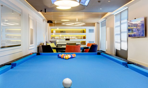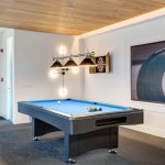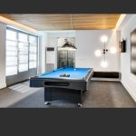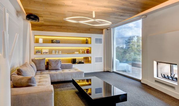 The focus of the architectural design is the business meeting. With the stock market in mind, TV screens facilitate the control of key information pieces. Presentation and projection screens & equipment are harmonically combined with the white piano, the bright fireplace and the blue-felt billiard.