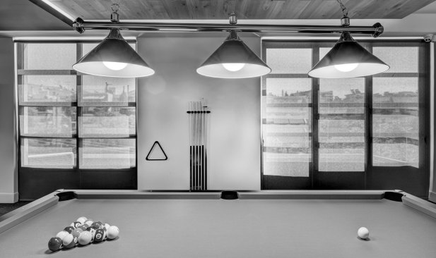 With a complementary functional blueprint of the lower levels, the three basic sections of the space were subdivided and projected into the highest level of the building. Seating area, meeting rooms and games room respectively. Three sections whose boundaries are depicted on its roof.