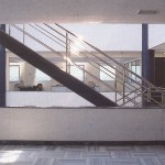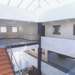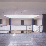 Situated in a recently developed industrial park, this chemical production facility for textile industry has a three-story administrative center, connected with a large production wing. The entrance hall to the administrative building is a three-story atrium space onto which the corridors of upper floor areas open. One of the main design decisions was to create a central atrium that served as a natural resource for passive solar heating and daylighting. The atrium space also receives light from a two-story glass-block entrance wall. The production wing accommodates chemical mixing tanks on the upper level and storage below. A partial mezzanine within the production wing has a laboratory and a workers’ cafeteria, both overlooking the production areas. The dark blue plaster of the administrative wing matches with colors applied over the light gray insulating panels on the production wing. Skylit spaces also highlight interior pastel colors.