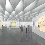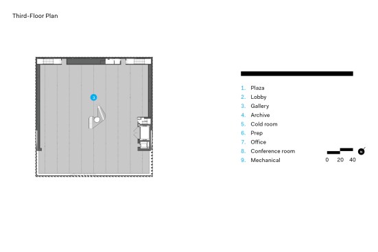 Dubbed "the veil and the vault," the museum's design merges the two key programs of the building: public exhibition space and the archive/storage that will support The Broad Art Foundation’s lending activities. Rather than relegate the archive/storage to secondary status, "the vault" plays a key role in shaping the museum experience from entry to exit. Its heavy opaque mass is always in view, hovering midway in the building. Its carved underside shapes the lobby below and public circulation routes. Its top surface is the floor of the exhibition space. The vault is enveloped on all sides by the "veil," an airy, cellular exoskeleton structure that spans across the block-long gallery and provides filtered natural daylight. The museum’s "veil" lifts at the corners, welcoming visitors into an active lobby with a bookshop and espresso bar. The public is then drawn upwards via escalator, tunneling through the archive, arriving onto an acre of column-free exhibition space bathed in diffuse light. This 24' high space is fully flexible to be shaped into galleries according to curatorial needs. Departure from the exhibition space is a return trip through the vault via a winding stair that offers glimpses into the vast holdings of the collection.