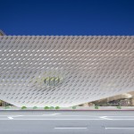 Set in the cultural district along the City of Angels’ Grand Avenue, just south of Gehry Partners’ Walt Disney Concert Hall, the building accommodates two programs of the Broad Art Foundation. Its two-fold function—public exhibition space and an art archive supporting its lending activities—is manifested in a “veil and vault” design concept. The vault is an opaque mass hovering in the heart of the block-long structure; the veil is a cellular exoskeleton enveloping the surrounding volume, lifted at two corners to welcome the public. From the lobby, visitors are funneled upward on an escalator to an acre-sized, column-free gallery lit by diffuse light from the skylight-pierced roof. The return to the lobby is down a twisting stair that offers views into the vault’s holdings. A “pucker” on the avenue front draws a portion of the cellular envelope inward to the foundation’s conference room. Juror Nataly Gattegno cited the “interesting material explorations” of that envelope, which is constructed principally of glass-fiber-reinforced concrete. —John Morris Dixon, FAIA