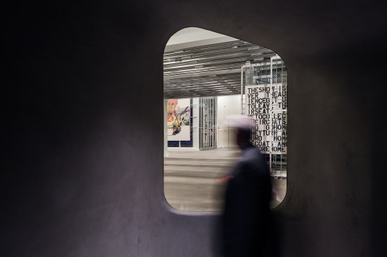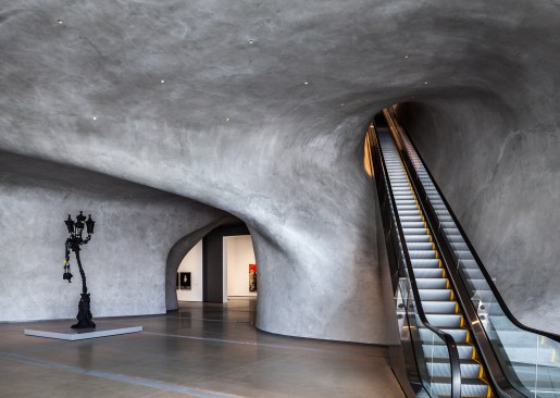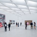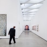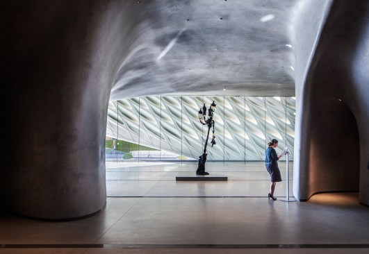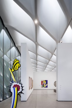 That sense of scale makes the building legible, as billboards in L.A. should be, from a moving car; but the building is also attuned to the visitor on foot, signaling its frontality with the great cyclopean eye on its façade, inviting visitors in with its glassed-in rez-de-chaussée, and then sending them up an escalator through the mysterious concrete “vault” (containing conservation and storage facilities) to the 50,000-square-foot open exhibition floor, which is suffused with light and allows for nearly infinite configurations of temporary walled-in galleries.