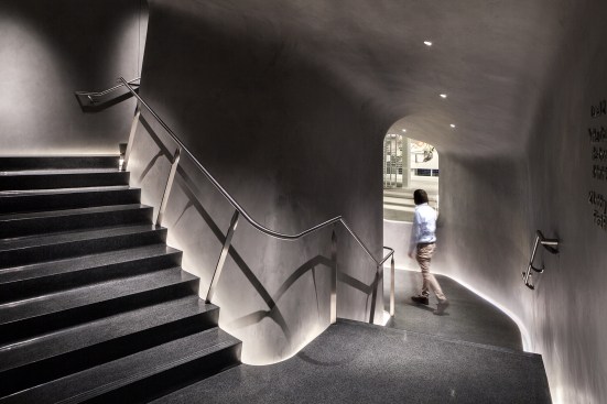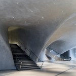 Simultaneously sedate and spectacular. It fits the context of the visually exuberant arts buildings in this neighborhood. More than holding its own as a figure, it also engages and takes the user in. The dark body-like, shapely vault is a beautiful counterpoint to the bright, thick, patterned light veil. The design intention is clear and carried through at every scale. The types of space created are unusual but engaging and composed.