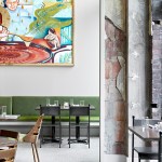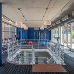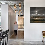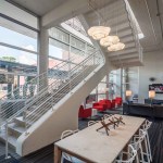 Many original design elements were restored, including wood windows, terrazzo tile floor, decorative plaster ceilings, moldings, painted building signage, and the distinctive rooftop sign structure. Connecting the two buildings, a sculptural, concrete stair has been returned to its midcentury glory.—E.K.