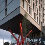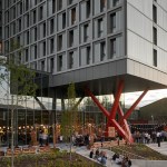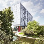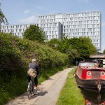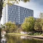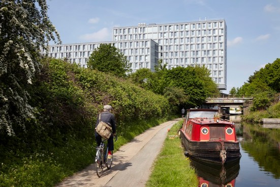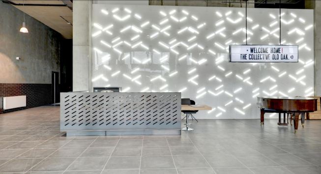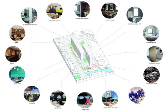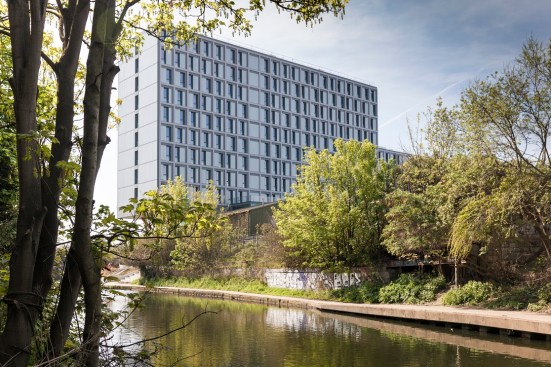 The Collective Old Oak will be the world’s largest co-living space and will form a new hub for urban professionals in West London. Our design for this unprecedented building creates a new hybrid typology, redefining the architecture of living and working to suit the unique community of people that will develop here. The project reinvents collective living for today, laminating together a series of complimentary programs and atmospheres to form a strategy for the future of housing. The provision of housing is in crisis, not just in London but around the world. How can we reinvigorate tired typologies and create a building which responds to the multitude of needs and networks of city dwellers? How can architecture capitalise on the cross pollination of different uses and users of a truly mixed use building? The building takes the form of two slim volumes sliding across one another and centered on a central core. This central hub increases opportunities for interaction between residents, and makes circulation between floors as simple as possible. A series of unique amenity spaces fills the central hub, each designed to appeal to millennials and to be used by all the building’s residents. A games room, spa, secret garden, cinema, library and disco launderette, many of which are directly connected to adjacent communal kitchens, which offer facilities above the kitchens in individual units. A key element of the design is the windows at the ends of each connecting hall which provide views out over the surroundings. The two connected volumes sit on a large podium, which offers generous floor to floor heights and total transparency to accommodate the co-working floor, communal gym, restaurant, lobby and a retail space. More than 700 square metres of landscaped gardens are spread across two roof terraces on the building’s podium, offering views out over the landscape and the canal and providing spaces for events in summer. The building’s upper stories are lifted up above a public plaza facing onto the canal by a dramatic branching column in fire engine red. This gesture of deference to the public space and collective activity by the canal sets the building apart from a standard residential block, offering up a piece of space for communal use. The building is clad almost entirely in glass which reflects the lighting conditions at any given time of day. Its luminescent form shines on the skyline as a beacon of the area’s regeneration, and as a thesis for the future of collective living.