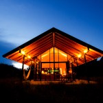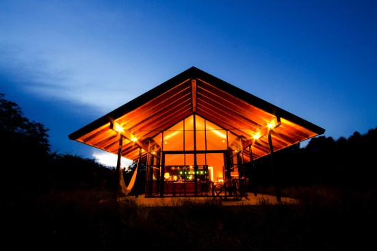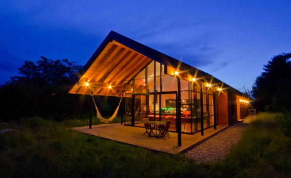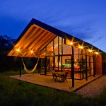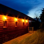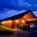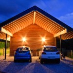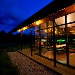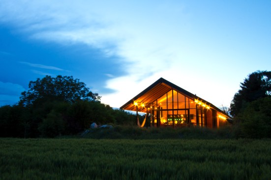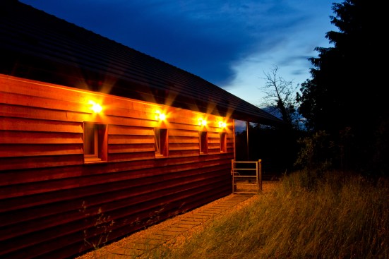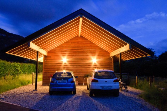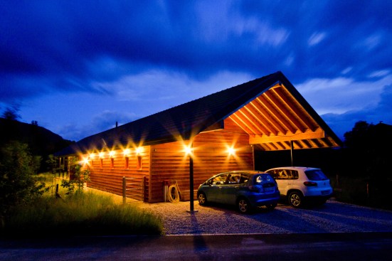 The exterior walls are made of rough sawn larch wood often used for traditional mountain stables contrasting with contemporary black aluminium and glass
