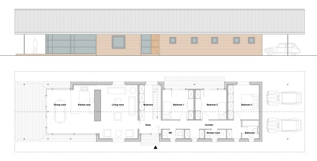 The garage and the outside terrace are extensions of the roof enabling to stretch even further the structure, giving it this particular elongated shape.