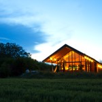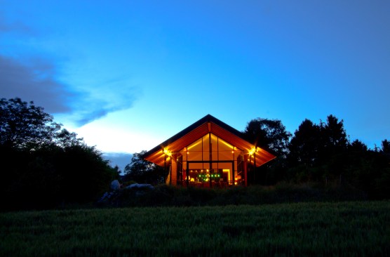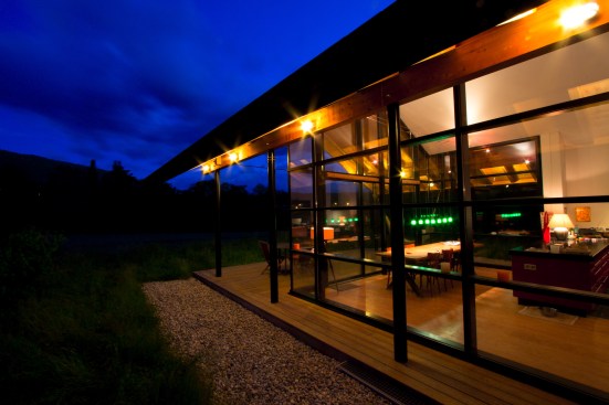 The roof has long overhangs in order to protect the large glazed openings from direct sunlight enabling the kitchen area to have a very subtle and soft light.