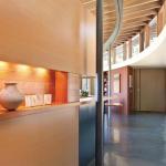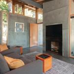 Because the natural clearing narrows toward the water, Herrin’s one-room-deep plan bends in a shallow arc that orients each part of the house toward a different prospect. “It’s not a one-liner,” he says. “It keeps changing as you walk through it.” The plan wraps around a broad rock outcropping, opening between the main house and the guest suite into a covered courtyard that preserves a cluster of mature madrone trees. The building’s shed-roof section echoes the slope of the land, rising from a wall of west-facing glass to a band of clerestory windows that take in the tree canopy to the east.