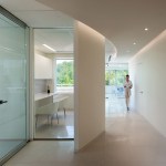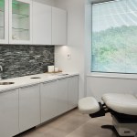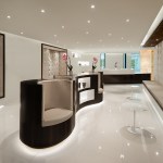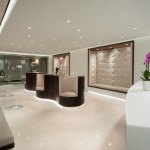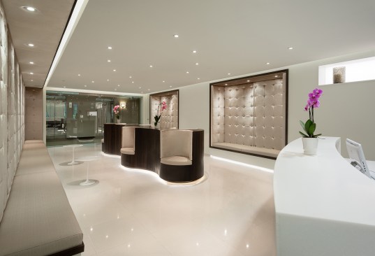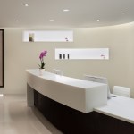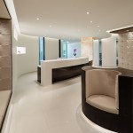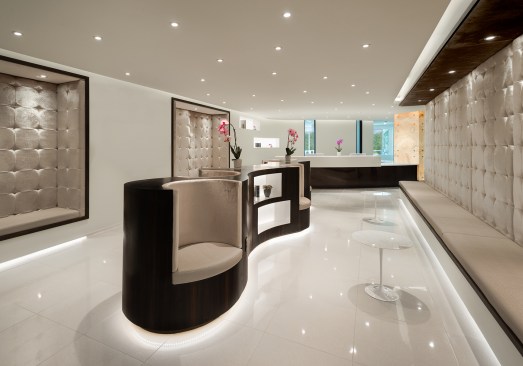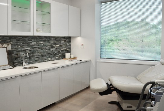A crisp, hospitality-influenced aesthetic was created by breaking away from the traditionally furnished waiting room to a contemporary ensemble of built-in seating elements and edge-lit partitions. Ceiling lights were carefully positioned to reflect in the polished oversized floor tile, creating a feeling of space and height