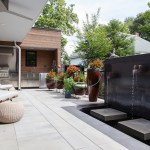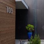From the driveway and garage, a scored concrete walkway leads directly to the main entrance, which is deeply recessed into the façade, creating a sheltering “front porch” sans attached structure. The steel wall at the entrance continues into the foyer where lighted niches within it display objets d’art from the doctor’s collection.