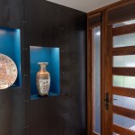 From the driveway and garage, a scored concrete walkway leads directly to the main entrance, which is deeply recessed into the façade, creating a sheltering “front porch” sans attached structure. The steel wall at the entrance continues into the foyer where lighted niches within it display objets d’art from the doctor’s collection.