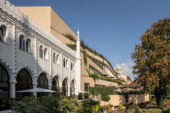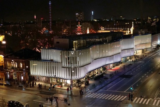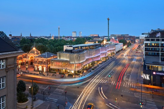 Combining hospitality and other commercial tenants inside a nearly 100,000-square-foot space, the building is a multifunctional pendant to Copenhagen’s most celebrated recreational attraction: the Tivoli Gardens, the nearly two-century-old fairgrounds. One of the first amusement parks in the world—and an inspiration to Walt Disney, among others—the Gardens create a brief opening in the city’s built fabric. (During the pandemic this spring, the lushly landscaped spaces were repurposed as makeshift kindergarten classrooms.)