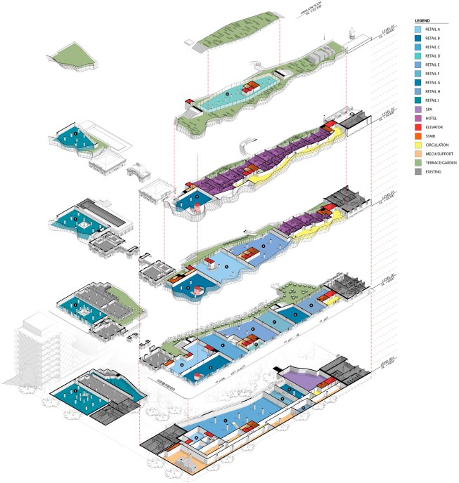 COMPONENTS: 8,500 m2 / 91,500 ft2 gross area; hotel, restaurants, food hall, retail