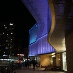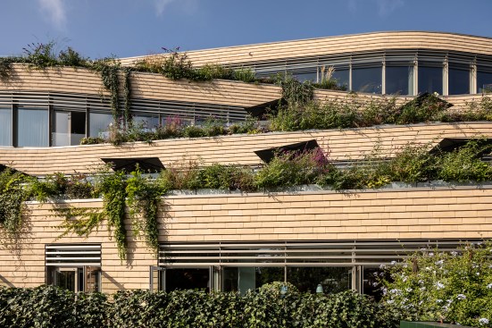 PCF&P responded to the significance of the site with a design that feels at once energetic and serene. Launching over a set-back rez-de-chaussée, the building’s long, winding façade (a nod to the city wall that once stood on the site) is marked by the vertical strips of an internal brise-soleil, which gives it an orderly rhythm even as it ranges sinuously around its corner site. Roof decks, thickly planted terra cotta terraces facing the park, and an elaborate evening lighting scheme throughout all make the building appear to bristle with activity, but its simple materials palette of glass and steel keeps it well in line with the Danish Modernist spirit—as well as the spirit of PCF&P itself, still innovative after six decades in practice.