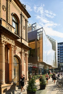 The new building is both a framing portal and a curving mirror – a portal to the fanciful world of Tivoli and a mirror, amplifying the very real and vivid life of Copenhagen. It allows the two worlds to touch and overlay. Cantilevering out on the city side, the building shares in the vitality of the street. It enfolds rather than delimits. By capturing the nuances of the changing, light and unfolding with passage its variable form is designed to enrich the experience of passers-by. . From within, you are invited to drift above and along Bernstorffsgade. On the garden side, its terracotta terraces weave together and step back, beneath the Copenhagen sky, Hemmed with lush plantings, these terraces present panoramic views of the beloved Pantomime theatre, Tivoli’s stately trees, and the relaxed life of the garden playing out below.