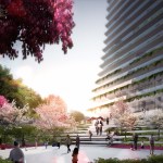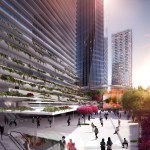 Fundamental to the concept for both towers is a shared architectural vocabulary of horizontal ledges. The horizontal ledges help shade the fully glazed façades of the buildings and balance the desire for maximum daylight with the energy performance requirements of a high-performance building envelope. The terraces and decks provide public spaces and landscaped areas for recreation, activity or relaxation, and seamlessly merge with the horizontal ledges of the upper floors. The horizontal ledges fulfil multiple functions as shading, planters and balconies. The integration of green spaces on multiple levels adds outside spaces, reduces air pollutants and enhances the microclimate. The landscape stimulates the senses with colour, fragrance and sound. Waterfalls will both reflect natural light and enhance the urban soundscape through the sound of moving water.
