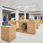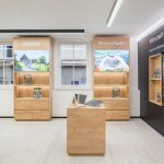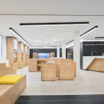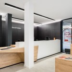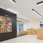 Visitors will get an overview of the space immediately upon entry and are guided through the area intuitively. Looking straight ahead reveals a spacious staircase that serves as the connecting element between the lower and upper retail space. On the right side, visitors can approach the constantly manned reception desk or obtain current information via the screen integrated into the wall. On the left side, a window display, which can be seen from the outside, stretches along the facade, up the staircase, and into an inviting seating area. This display forms the start of a row of cube-shaped wall shelves and merchandise display units for retail and presentation. These shelves and display units are designed and arranged specifically for the products to encourage visitors to browse. The pendant lights used here highlight the merchandise on display and constitute an impressive light installation on their own. The rest of the space is illuminated by black surface-mounted ceiling lights with a graphical appearance to create a neutral atmosphere. There are likewise two pieces of service furniture available on the upper level – including seating furniture where necessary – for providing information and advice.