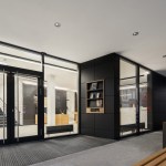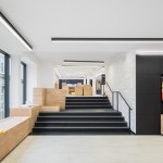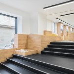 The colour and material concept revolves around a light-dark contrast and natural colours. The anthracite-coloured corporate wall surrounding the space is a design element that establishes the space’s identity and connects the individual zones together. At the same time, it offers additional uses by providing room for shelves, noticeboards, displays, window displays and storage space as well as functioning as an acoustic barrier. This, in combination with oak furniture, bright flooring and a white suspended ceiling, creates a friendly, modern atmosphere. The colours are reversed in the staircase area, making the backlit line art with motifs of the city of Schwäbisch Hall fully come alive. Multimedia screens, digital panels and high-quality photographic images are placed throughout the entire space and complete the image of the city.