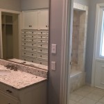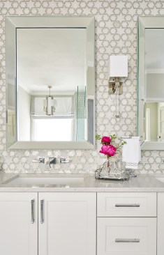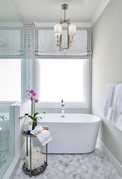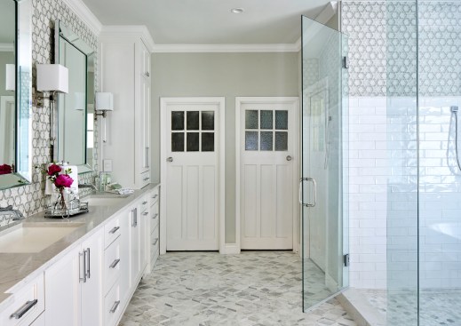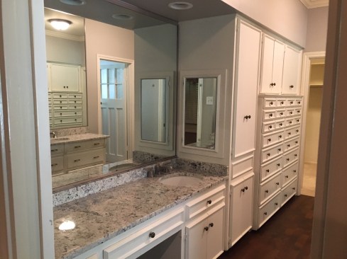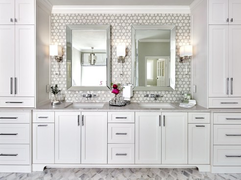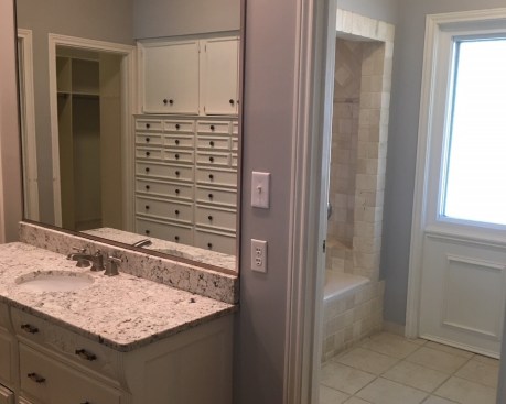 Our clients purchased a home with a less than desirable master bath. The shower did not function and the layout of the room was not ideal. They longed for a tranquil master bath to unwind in after a long hard day. The feeling of the new space was designed to be soothing, peaceful and welcoming, with luxury touches. And, of course, the new space had to function for their busy lifestyles, as well. We began by tearing out the layered wood flooring and an additional floor tile layer beneath it. Then we removed the large existing vanity cabinets and the furr down at the ceiling to open up the space. We combined the two new vanity sinks together on one long wall to free up the opposite wall. Next, we featured a frameless glass shower and a soaking tub on the wall facing the new vanity. Removing the old wall between the shower area and the rest of the bathroom made the space seem much larger! A new window with privacy glass was installed over the new soaking tub to obscure the view. Finally, the tranquil bathroom was finished with a custom colored mosaic backsplash, chrome wall mounted faucets, and sparkling chrome and crystal lighting fixtures. The pale watery wall color provides a soothing backdrop that perfectly complements the custom glass mosaic tile. This tranquil bathroom provides the perfect spot to relax at the end of a long day. Challenge #1: When the countertops arrived, the sink holes were cut 37” wide, instead of 27” wide, because the fabricator accidentally entered the wrong number into the computer program. The slab was a total waste and we had to wait four weeks to get another one because the countertop slabs were special order. Solution #1: We kept the project timeline on track by switching our focus to finishing the shower tile and tub installation instead of working on the vanity wall. When the countertops were installed correctly a month later, they looked beautiful and were worth the wait. Challenge #2: The shower floor tile was paper faced, meaning that it came with brown paper on the front side. The installer installed it, waited for it to dry and then peeled the brown paper off to grout it and we discovered that the tile vendor had made a mistake and sent us the totally wrong shower floor tile. We didn’t realize it until all the paper was pulled off and it was all installed. Solution #2: We had to rip out the wrong shower floor tile and refloat the shower floor. Then, we had to find a replacement tile that was in stock to match the rest of the bathroom because the tile that we originally selected was special order, custom color and would take six weeks to receive more. We were able to locate a coordinating marble hexagon tile and now no one knows that it was actually our second choice unless we tell them. Challenge #3: We added a soaking tub in front of the window that used to be a doorway to the pool. Since it had been a doorway previously, we only had 57” of width to work with to fit in a tub. We had a hard time sourcing a tub that short, but we eventually found and ordered one that was 55" wide, only to be told a few weeks later that it was backordered indefinitely. Solution #3: We looked at many places and finally located a 53” wide tub that was in stock and we ordered it. It’s a perfect fit for the space and for our petite client. Challenge #4: The tile installer laid the paper faced mosaic tile on the vanity wall running in the wrong direction and it was all installed and grouted when we saw the mistake. Solution #4: By this point, we were sure that this bathroom was cursed! Haha But, we reordered the special order, custom color tile and paid to rush it. It arrived in about 3 ½ weeks and we were able to install it correctly and finish the project at just two weeks over our initial estimate. The client actually ended up respecting us more because of the professional way that we handled the issues and for the fact that we refused to give up until they were solved.