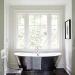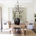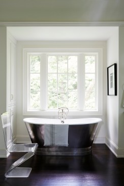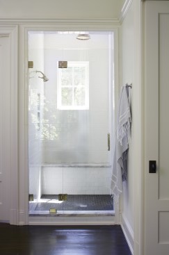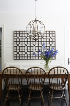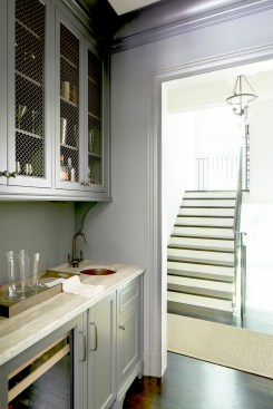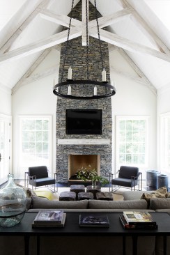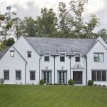 This residence by Harrison Design resembles a French farmhouse, with a simple painted-brick veneer and cedar shingle roof. Other than the classical pediment designating the entry, the only exterior embellishment is grey trim and a quiet diaper brick pattern. Three sets of glass-paned double doors on the front allow natural light to flood the interior. In the great room, whitewashed timbers accent the vaulted ceiling, with the stone fireplace and two-story chimney the focal point. From the back, the seven gables make the house appear like it’s been added to over the years. Symmetry and restraint are the keystones of the architecture.