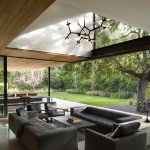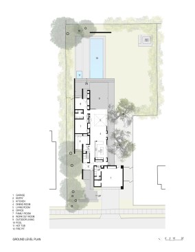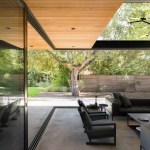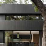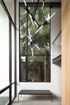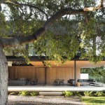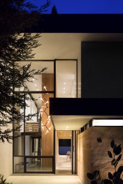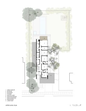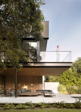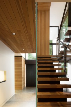This single-family residence is situated in a dense suburban context in northern California. The temperate climate of this location presented an inherent dilemma: balancing privacy with the desire to spend time in the site's outdoors spaces. In addition to the inherent characteristics of the site, the owner brought specific criteria to the design process that would ultimately inform its outcome. As a family with two children, one of which has hearing sensitivities, they desired a house that was very open and loft like, but that offered enclaved spaces that provide privacy and acoustic refuge. This combined with an overarching desire to engage the landscape led to a design that treats indoor and outdoor rooms as interchangeable. Anchored by monumental coastal live oaks and majestic redwoods, this sustainably-designed home offers expansive living spaces that extend into the landscape. The existing trees inform a spatial arrangement of framed views, outdoor rooms, and screening for privacy. A series of interlocking vertical and horizontal volumes help to obscure the demarcation of inside and outside. Concrete floors, wood ceilings, and reflection from glass participate in a virtual fusion between the homes interior and its landscape. A zinc metal canopy mediates the homes relationship to its surroundings and serves to edit unwanted views of neighboring properties and afford mutual privacy. The zinc skin frames a stand of redwoods at the entry, provides privacy for sleeping spaces on the second floor while engaging adjacent tree canopies, and lifts at the ground floor to allow interior space to spill into the landscape. This spatial arrangement enables passive ventilation and stack effect. The home's concrete plinth, steel and glass armature, and zinc skin respond to the site's high water table, allowing both interior and exterior ground floor spaces to float in the landscape and resonate with its natural splendor.