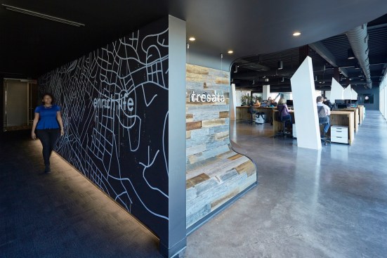Tresata, a predictive analytics software company, contrasts many of the more conventional companies in Charlotte, NC, where it was founded in 2011. Tresata, whose overall mission is to Enrich Life, wanted its new headquarters to reflect its innovative culture and brand. Thus, Tresata partnered with IA and chose contrast as the overarching concept—divergence from the expected—expressed through four design elements: portal, bent-plate ceiling, pivot, and slant, punctuated by subtle references to the firm’s name and key brand elements.