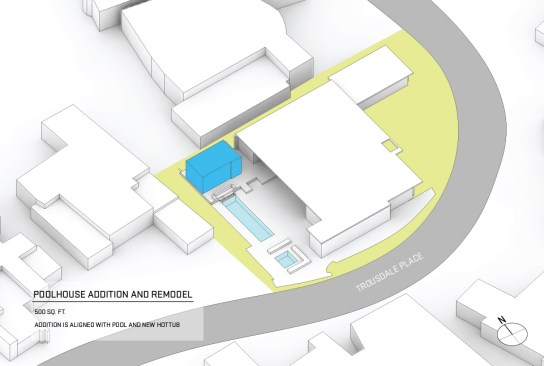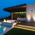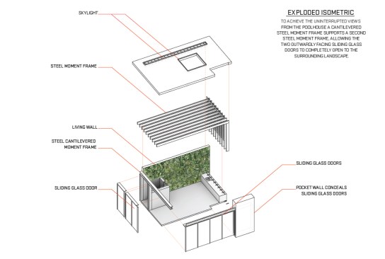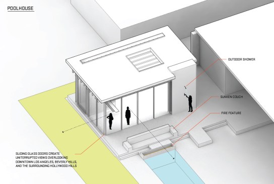 To complete the overall composition of the project, we added a 480 SF detached pool house with a built in sunken fire pit and a private jacuzzi on the hillside. Our design objective for the new pool house was to create a structure that doesn’t interrupt the city views from the main house or inside the pool house. To achieve this viewing concern, we designed a series of cantilevered steel moment frames that are supported by a second cantilever steel moment frame. This allows the outwardly facing corner to be free from a structural column or wall, allowing the sliding glass doors to completely open up to the surrounding landscape areas and city views.