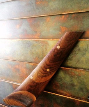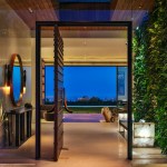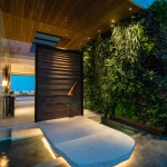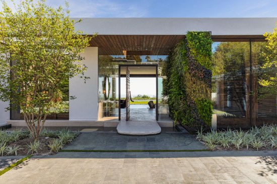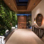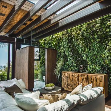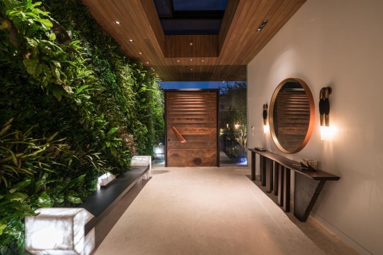 The first impression when approaching and entering the home is one of the most important design challenges. The aesthetics of the home and entry should create a memorable experience and orient the person towards the rest of the house in a concise way. We used a mixture of warm materials such as natural wood, copper, limestone, marble and a touch of exposed steel to create a warm, industrial, sophisticated environment. The main entry consists of crossing on a solid limestone bridge suspended over a reflecting pool. The front door is a 6’ x 9’ custom pivot door floating inside a frameless glass facade. The door is cladded with an acid wash copper finish. Attached to the door is a custom door handle made out of black walnut. There is a 14 foot high vertical green wall the leads the person from the driveway through the sunlight foyer and into the main living area. All the interior spaces were opened up visually and physically to the landscaping areas and the panoramic City views.