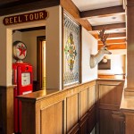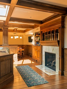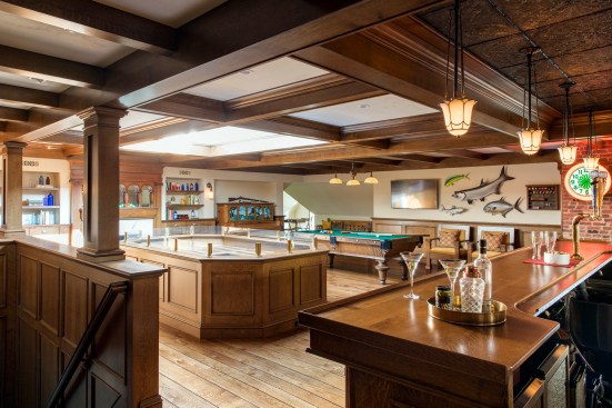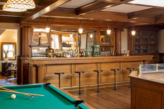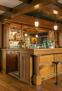 The bar in the gentlemen’s pub tested Day and LDa. The bar was pieced together from antique and new components from across the country in order to create the image of an authentic element. Day and his team procured the back of the bar from a man in Colorado who sold and distributed antique bar pieces, and the bar itself came from a Midwestern tavern. The elements were then married together by local craftsman. The bar needed to be lowered by crane through the skylight in the attic because it was too large to be brought up the stairs.