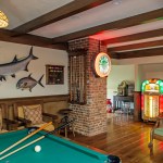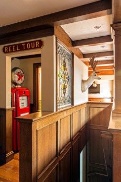 In addition to the modern updates on the first two floors of the home, the homeowners wanted a dramatic reimagining of the unfinished third-floor attic. They presented LDa Architecture with the vision of a gentlemen’s pub on the third floor, complete with period materials, furnishings, and collections. The homeowner had a number of antiques, including two barber poles, an old gas pump, an old Coke machine, several jukeboxes, an old Western piano, bottle collections, and card collections that he wanted to display in the Tudor-style home.