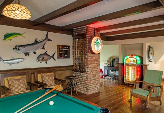 “[The bar] was his idea; he is a collector and he likes the things in the house to tell a story,” Day says. “Almost all the materials up there [in the attic], he owned and he was looking for a way to display them. So, we built the architecture around them, and then we found the fireplace surround, we found the tiles, and we found the bar.”