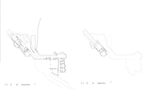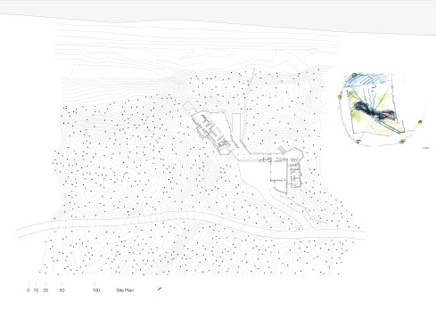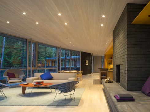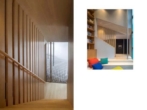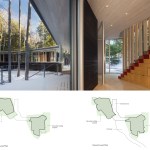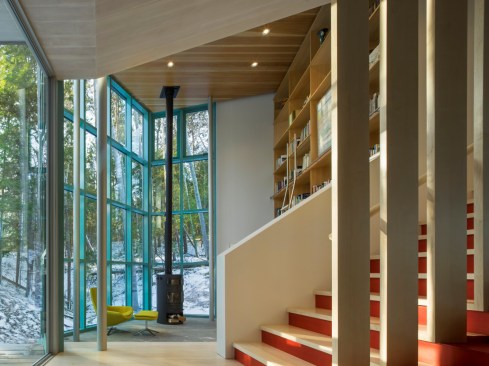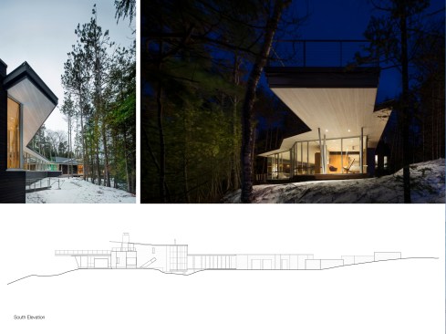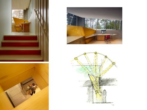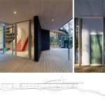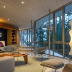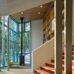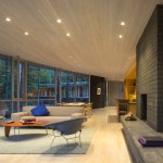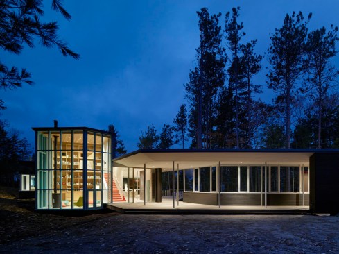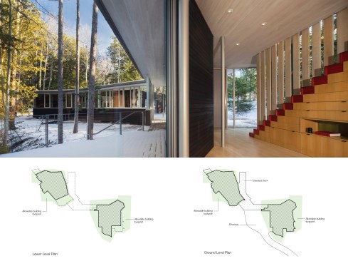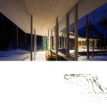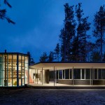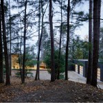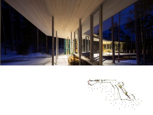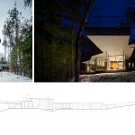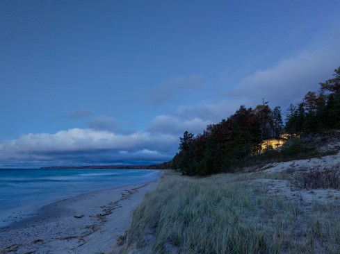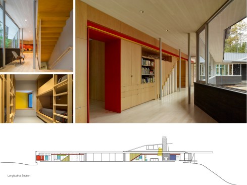 Tusen Takk is slipped into a rolling terrain of coastal sand dunes amongst a dense forest of red pines, cedars, and mixed hardwood that stretch along the northeastern shore of Michigan’s Leelanau Peninsula. Parallel to the shoreline the structures thread through the forest; a main house and separate guest house are perched on two adjoining dunes. Buildings foundations were permitted only within two irregular footprints of the 2.5 acre environmentally sensitive site. A sheltered elevated boardwalk floats above the dune, spanning a narrow gully to connect the two buildings. The main entry is marked by a tall glazed volume, a lantern in the evening forest. Exterior materials were selected that could withstand the severe winter conditions. Western red cedar siding is treated with a traditional Scandinavian finish of pigmented pine tar. The black stained wood walls veil all initial views of the lake, while inside the buildings a taut, faceted, aluminum framed glass skin blurs the boundary of inside and outside as the lake is glimpsed through breaks in the forest that edge the beach. Round painted steel columns provide the primary framing system; their loose arrangement akin to the tall red pine trees scattered across the property. The year-round residence is designed to respond to broad range of environmental factors. Operable windows in all rooms utilize the near-constant summer breezes to provide natural ventilation, eliminating the need for mechanical cooling. Bleached interior wood finishes glow with a soft northern light, minimizing the need for artificial lighting. Bright translucent stained colored stairs and cabinets tie the buildings together and also lift one’s spirits during the long winter months spent indoors. Long wood decks project across the edge of the dunes, providing both opportunities for outdoor activities as well as spectacular westerly views of sunsets over Lake Michigan. A center for family gathering, while also providing places for contemplation and retreat, it is a place of nuance and a place for discovery.