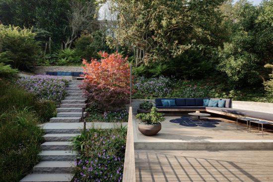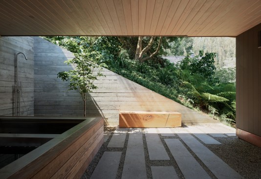 Overlooking the natural elegance of the Mount Sutro Open Reserve, the Twin Peaks Residence is a direct reflection of the occupants who live there, two highly active 30-somethings with a passion for yoga and a thirst for travel. Inspired by the sloping hill and bountiful garden, both client and architect worked in tandem to elevate the property into a modern transformation by opening up the original compartmentalized main floor, with the goal of visually and physically connecting it to the spacious rear yard. Originally, the home was disorienting and dim, manifested in the tight, windy staircase connecting the three floors. Now, light fills every corner of the living areas, making it a comfortable, accessible, and a beautiful space for the homeowners to pursue their respective hobbies and come home to after one of their many trips abroad. The structure of the house was kept largely intact to celebrate the exposed beams, high ceiling, and Japanese ski cabin-esque design. A light greywash was added to draw the dwelling together, as well as highly crafted materials and details to enhance its charm and create moments of architectural interest. Beneath a pitched ceiling and butterfly-like skylights, sits a cozy reading nook with direct access to a new roof deck, complete with auspicious views of the Golden Gate. The master bedroom is preceded by a yoga annex and allows immediate access to the rear garden, while the upper living space flows easily out to the comfortable hillside carrel. Running the height of the stairwell is a wood slat screen, acting as a privacy screen that still allows the light to gently filter in. While walking up the stairs, snippets of the garden tease the eyes through the delicate partition, yet the full view is hidden until reaching the top of the third floor; where its entirety is reflected back in the mirror directly across from the stair landing. The soft, minimalist pallet is enhanced by whimsical touches, a thoughtful collaboration between the architect and client. A blue velvet sofa, leather- topped bar stools, carefully chosen hexagonal doorknobs and collection of unique sculptures the client had picked up on a trip to Copenhagen create a diacritic space reflective of her unique personality. “Her direct involvement and excitement are what made this project so special,” says project lead designer Lindsey Theobald, “the home isn’t generic because of her willingness to take risks and add in fun details.”