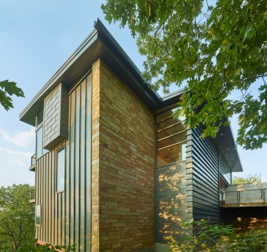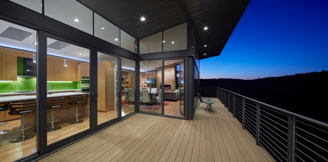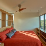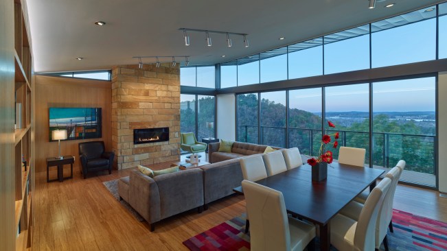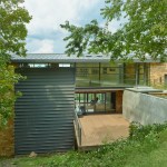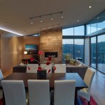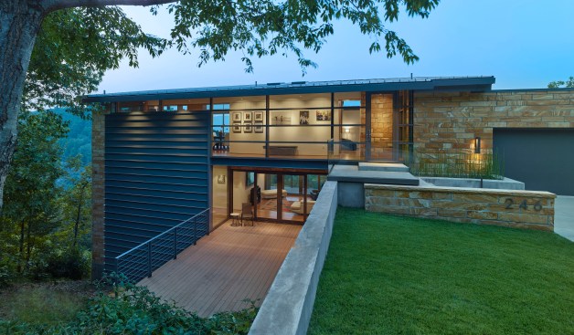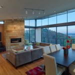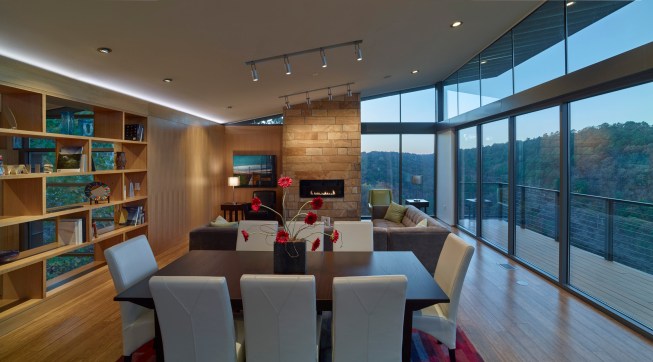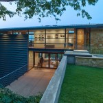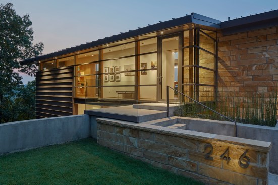 Negotiating an extremely steep site with panoramic views of the Arkansas River and Two Rivers Park, this multi-level home was designed to comfortably accommodate my family of four while incorporating the periodic need to entertain. Emphasis was given to maximizing view while exhibiting restraint in its design aesthetic. The home was realized as a narrow twenty-two foot wide bar, anchored by stone into the hillside. This maximizes view, allowing each space to align linearly along the panorama and its ambient north light. The stone wall serves as both a visual anchor and a physical barrier between the public entry and private living spaces. The material palate was limited to stone, steel and glass, with deliberate emphasis given to exterior views for color, and landscape for accent. The home is entered at the Upper Level Gallery, a largely transparent form that affronts the stone wall and transitions into a vertical communicating stair connecting each level of the house. This Gallery interconnects the public entertaining spaces on the Upper Level – Living, Dining and Kitchen. The Middle Level incorporates the Master Suite, Family Room and Guest Bedroom, while the Lower Level contains the children’s suite, with two bedrooms and a shared bath. The house incorporates sustainable initiatives through the use of recycled content, LED lighting, foam insulation, energy-star appliances, and high-performance mechanical systems. Restrained in both form and finish, the design intentionally sidesteps trendy forms, colors and materials in an effort to create a sophisticated, timeless residence incorporating the Modern design sensibilities of its owners.