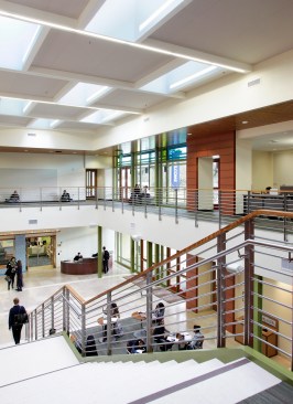 Sited at a significant campus intersection, the project is designed as a two-story building organized around a double-height lobby, study lounge and community “living room.” The three primary student organizations are located on the first floor, each having prominent exterior corner windows that identify the organizations and encourage students to participate in their activities. BAR worked with UC Davis’ architects, engineers, facilities planning department, administration, tenant groups and campus environmental committees to determine the sustainability measures for the project, including installation of permeable paving, photovoltaic-ready infrastructure and building materials with recycled content. In 2013, the SCC was Certified LEED Platinum.