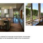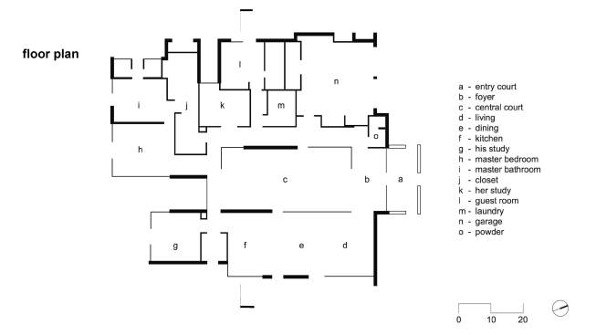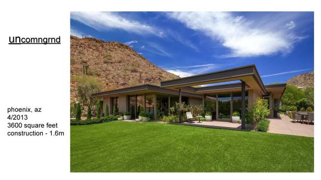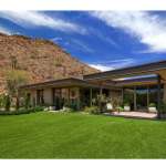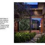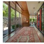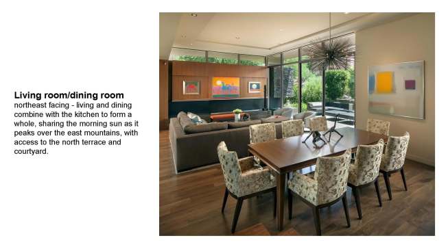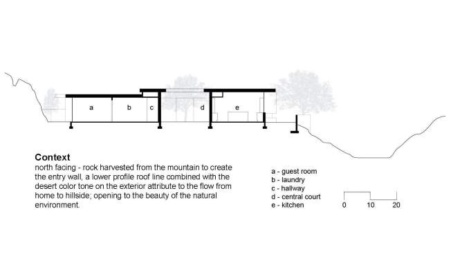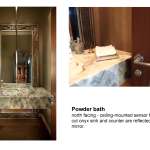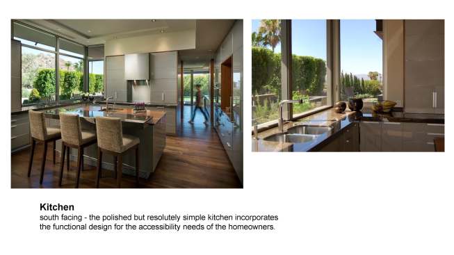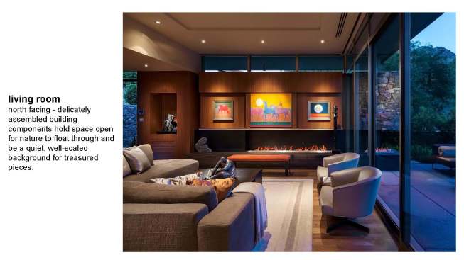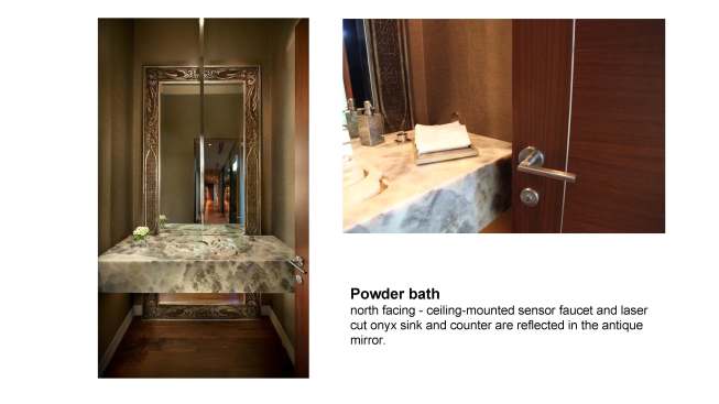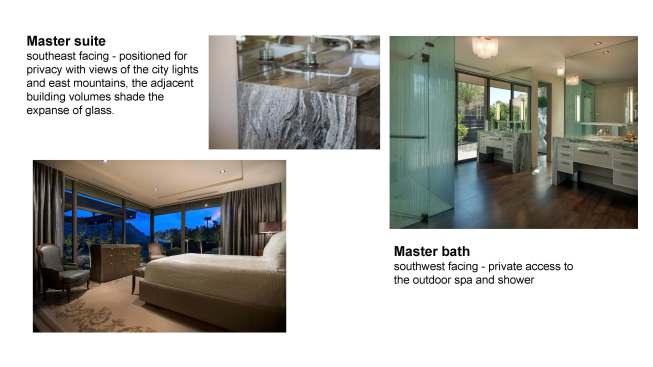 Creating a home of steel & glass around a central courtyard, while far from a seminal concept, was executed with a fresh focus to satisfy today’s lifestyle and serve as both sanctuary and sophisticated entertaining environment. The choice was made early on to have the architecture be a warm natural color inside and out in order to have the building planes create a calm and sophisticated composition. As the home is nestled into the desert mountainside, the architect and the builder worked together to meticulously feather the mountain back to both stabilize the face and bring out the natural beauty of the hillside’s colors, shadows, and shapes. The foyer sets the tone for the home, refined yet welcoming, connected to the outdoors, and inspired by the art collection. The warm character of the wood paneling is complemented by the glass walls. The living room’s delicately assembled building components hold space open for nature to float through and be a quiet, well-scaled background for treasured pieces. The living and dining room combine with the kitchen to form a whole, sharing the morning sun over the east mountains, with access to the north terrace and courtyard. The polished but resolutely simple kitchen incorporates the functional design for the accessibility needs of the homeowners. The two tiered island features walnut and granite counter tops. The powder bath features a ceiling sensor mounted faucet and a hayes inc. custom designed laser cut onyx sink, which are reflected in the antique mirror. The floor-to-ceiling operable glass walls allow light to flow through the public spaces. The courtyard plays a central role in bringing the outdoors in, allowing filtered sunlight into the home. The family enjoys the sounds from the water feature along with the micro-climate created by the olive trees and lush vegetation. The master suite is positioned for privacy with views of the city lights and east mountains, while the adjacent building’s volumes shade the expanse of glass. The master bathroom features matching granite vanities, Robern mirrors, and the hayes inc. designed sandblasted shower enclosure.
