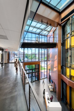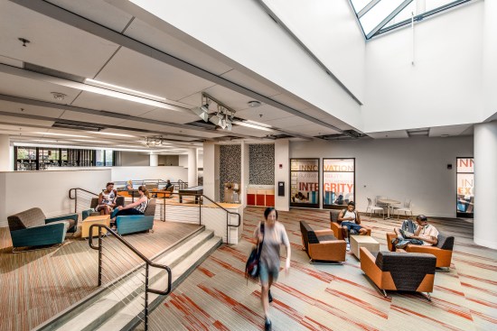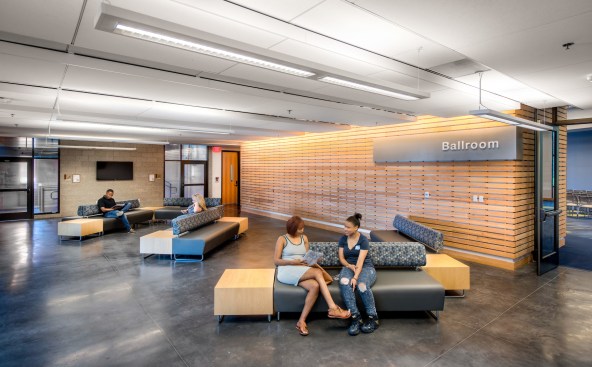 Inside, the 83,000 SF project houses areas for campus life, student government, career services and other student support functions, in addition to mixed-use retail, a conference center and ballroom, and a fitness and wellness center. Spaces are designed to encourage students to plug in and focus on academics, as well as to interact with peers they might not otherwise get the chance to meet.
