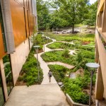 The design goal for the Student Center was to create a building that serves as a figural place-maker to identify the university as well as adhere to the university’s high standards for sustainability. The architectural design is composed of a combination of masonry, glass and bronze metal that modulates between the institutional nature of the campus and the pedestrian nature of the street. A clock tower rises high above the building, marking a new urban square teaming with students. Targeting LEED Platinum certification, sustainable design features are woven throughout the building, from a 14,000 sf green roof and photovoltaic panels to a rain garden and water treatment system that mitigates the amount and quality of water entering the city’s stormwater system.