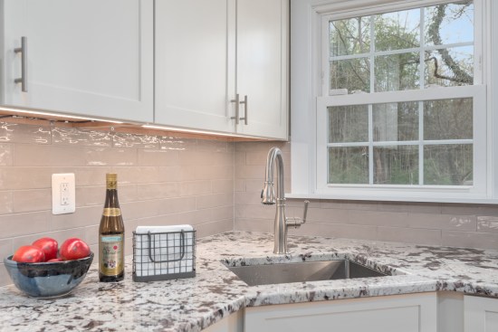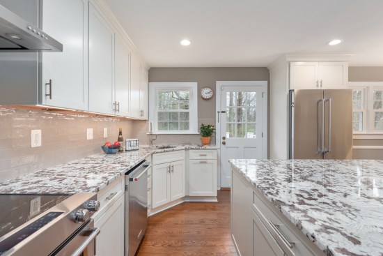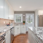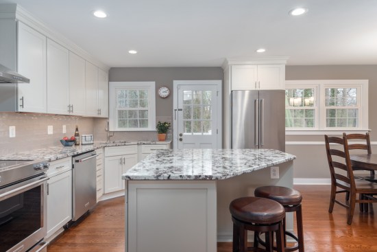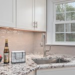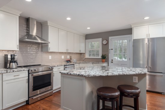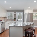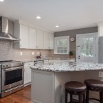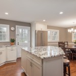 We began in the kitchen by installing a header to allow for better flow between the living room and kitchen. This also gave us the space needed for the large, polygon shaped island and two bar stools. Custom Schrock Pleasant Hill white shaker cabinets were used throughout with Alaskan White granite countertops. The Genesis 13 glossy tile backslash completes the look.