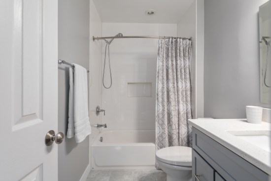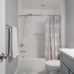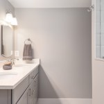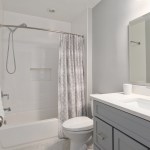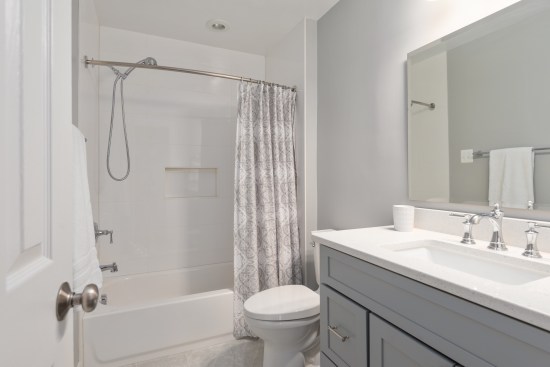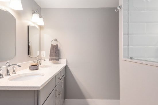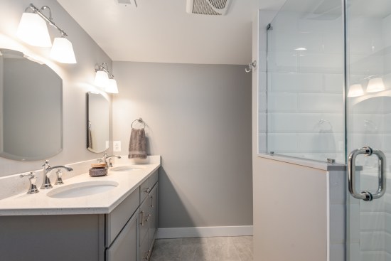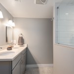 Similar materials and light grey/white finishes were used in the basement bathroom. We also replaced the bathtub with a walk-in shower. Daltile Annapolis white beveled 6 x 18 tile was used on the shower walls with the same London Grey tile on the shower and bathroom floor. Sleek chrome fixtures provide the finishing touch.