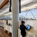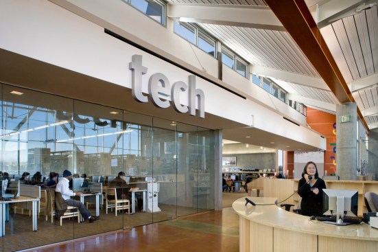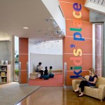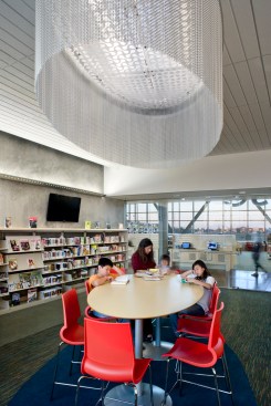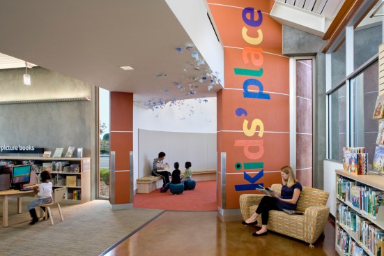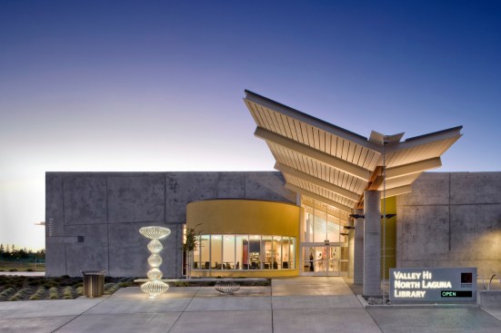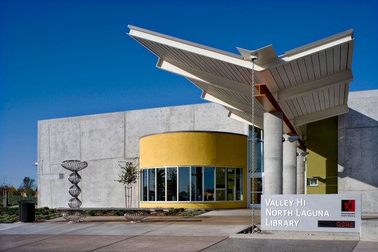 The City of Sacramento sought from the beginning to deliver a distinctive, flexible, high-performance branch library to this underserved yet growing community. The library is sited at an intersection unique within the community: planned high density multi-family housing to one side, Consumnes River College across the street, a new 10-acre park to the south, and retail and freeways within eyesight. The branch library seeks to establish an anchoring presence, while also being inspiring, sustainable, and low maintenance. This LEED Gold library sets a precedent for insulated tilt-up concrete walls and establishes a new standard for sustainability in a civic building. The V-shaped roofline mimics the shape of an open book and uses generous natural light to create a dynamic learning environment. The light-filled design, punctuated by a cheerful red tower that marks the children’s reading room, provides a welcoming landmark for this growing community. Inside, a brightly-painted steel beam accentuates the “spine” of the book and establishes a clear building organization. The design team collaborated with the library building committee to maximize square footage and provide daylit spaces for patrons and staff. Working from a program that outlined distinct service areas, the design team organized the interior spaces along a steel “spine,” continuing the imagery of an open book. The spine orients the patrons to the facility, and allows them to view into distinct spaces for children and teens, three group study areas, a learning center, and a computer lab with internet and word processing. Generous spaces, now common in libraries, include a community meeting room that can accommodate as many as 100 people, and a food court for refreshments and socializing. Early in the project we held an Eco-Charette with all stakeholders to identify the sustainable design features. Our solutions included extensive daylighting, a natural ventilation tower, and use of insulated concrete panels to increase thermal mass. We participated in Sacramento Municipal Utility District’s Savings by Design Program. Our team successfully obtained a design team incentive grant for an additional modeling analysis to demonstrate the high thermal properties of the insulated concrete. By following the program’s Whole Building Approach, the new building exceeds California’s Title 24 energy code by 34%.